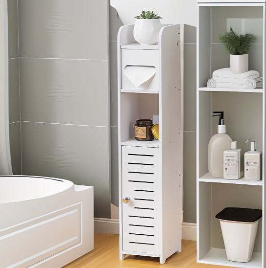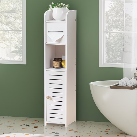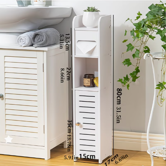 A STORIX szekrényt kifejezetten keskeny helyekre tervezték, ahol minden centiméter számít. Karcsú formájának köszönhetően könnyedén elfér a mosdó és a WC között, a fal melletti szűk helyeken vagy más, nehezen kihasználható sarkokban. A beépített WC-papír tartó kényelmes használatot biztosít, a további fiókok és nyitott polcok pedig gondoskodnak arról, hogy minden fürdőszobai kellék mindig kéznél legyen, mégis elrejtve a kíváncsi tekintetek elől.