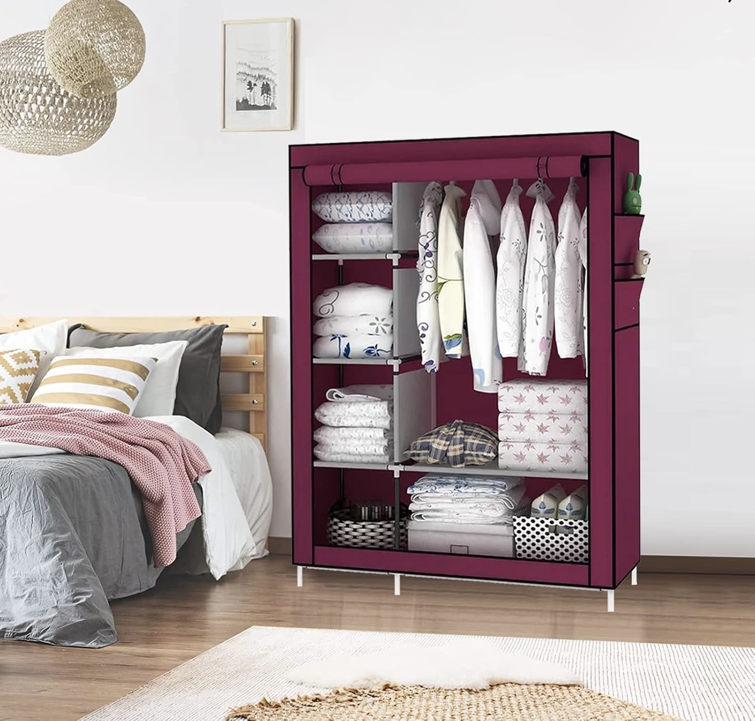 A könnyű, de stabil fémkeretnek és a nemszőtt textil huzatnak köszönhetően a szekrény könnyedén mozgatható és bárhol elhelyezhető – hálószobában, előszobában, gyerekszobában vagy akár nyaralóban is.